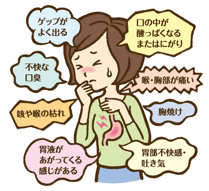 逆流性食道炎の症状では、ほとんどの方が胸やけを訴えられます。他にも様々な症状があります。このような症状が有る場合は、受診の際に医師にお伝えください。